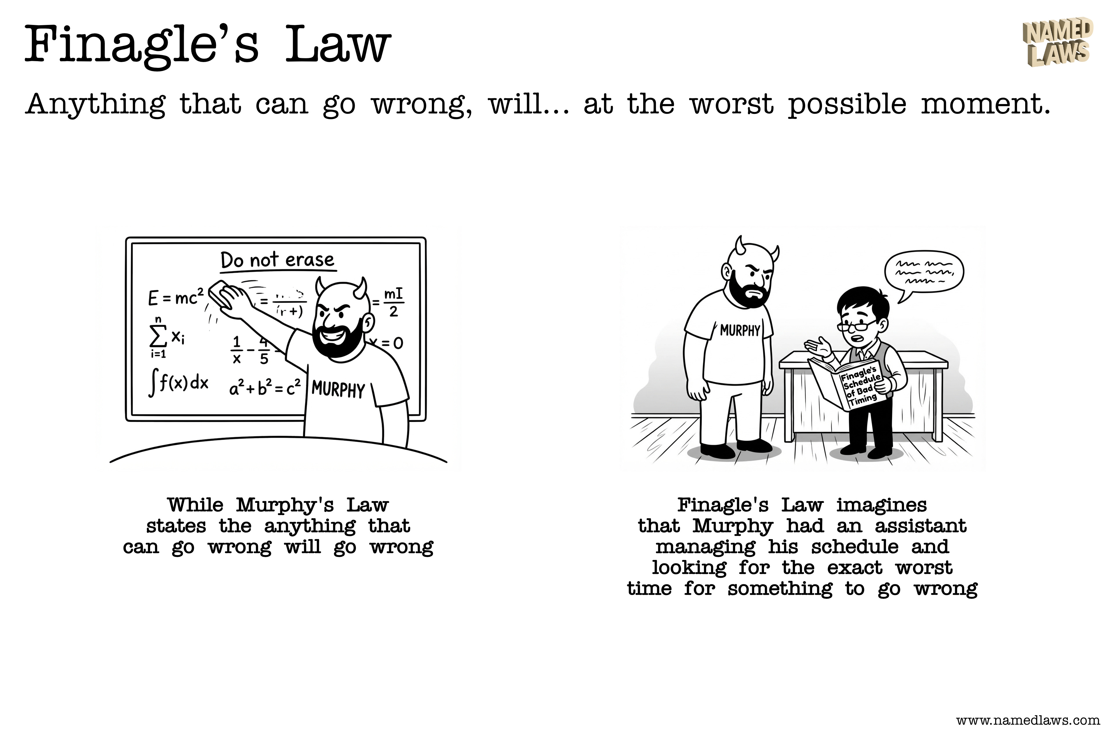 Finagle’s Law is sometimes called the “Law of Dynamic Negatives,” which is a fancy way of saying that things will conspire to go wrong in the most damaging way possible. It’s the recognition that a single failure often triggers a cascade of other failures, creating a perfect storm of disaster.